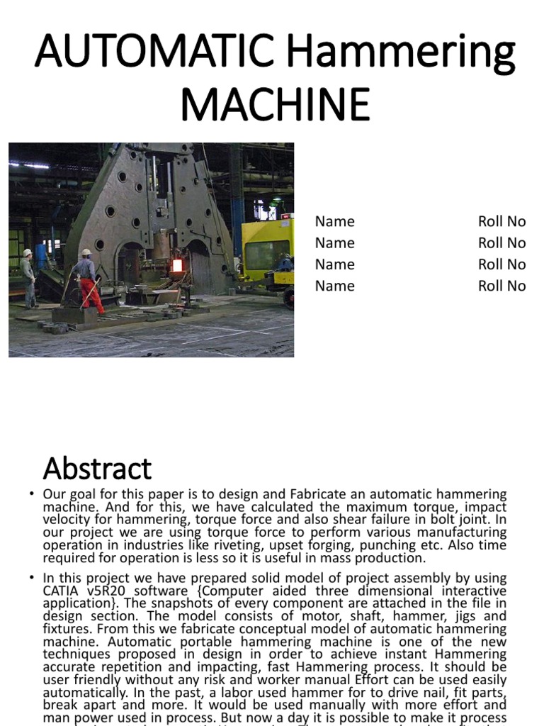 AUTOMATIC PORTABLE HAMMERING MACHINE REPORT Automatic Hammering Machine Ppt It is equipped with safety. this machine will perform accurate, fast and automated hammering whenever and wherever needed using a 12v battery. what is automated hammering machine? this paper describes cad modeling, design and analysis of automatic portable hammering machine. The document describes a project to design an automated hammering machine undertaken by 6 students at central.. Automatic Hammering Machine Ppt.